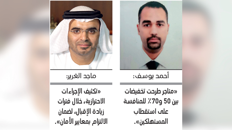وأوضح الغرير أن «هناك تكثيفاً لإجراءات السلامة الاحترازية بمراكز التسوّق، خلال فترات زيادة الإقبال حالياً، لضمان الالتزام بمعايير الأمان، مثل التباعد وارتداء الكمامات طوال فترات التسوّق».