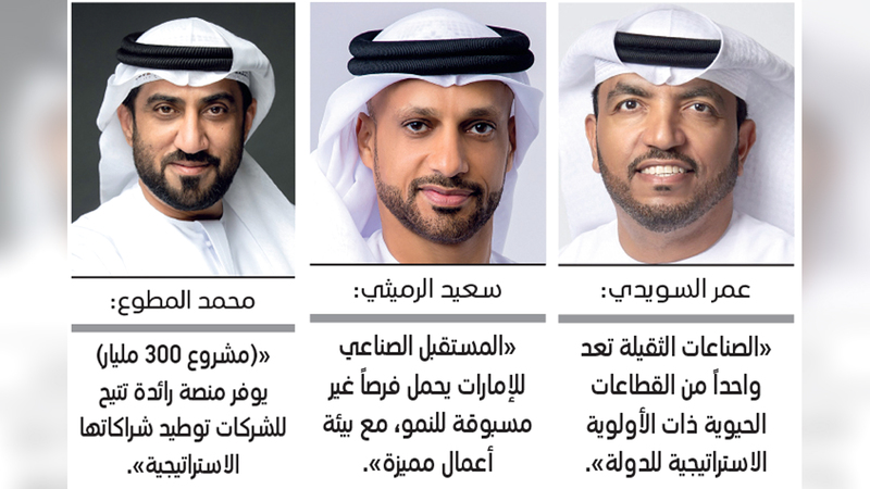 وتفصيلاً، قال وكيل وزارة الصناعة والتكنولوجيا المتقدمة، عمر صوينع السويدي، إن دولة الإمارات ستشهد خلال الأعوام القليلة المقبلة تطورات كبيرة في قطاع الصناعات الثقيلة، التي تشمل صناعات الحديد والألمنيوم والإسمنت والبتروكيماويات، فضلاً عن صناعة الآلات والمعدات والصناعات الورقية.