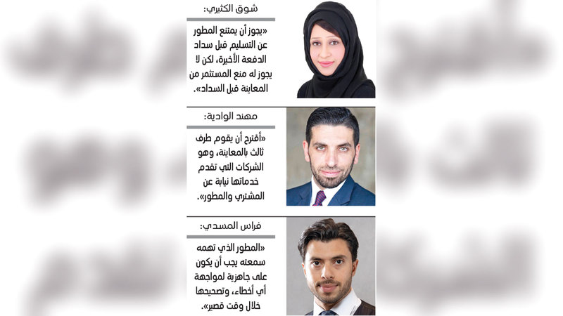 واقترح الوادية أن يقوم طرف ثالث بالمعاينة، وهذا الطرف الثالث موجود بالفعل عبر الشركات التي تقدم خدمات المعاينة بالنيابة عن المشتري وعن المطور، لافتاً إلى أنه لابد من أن يتم ذكر الملاحظات المتعلقة بالمعاينة، ويتم الاتفاق عليها ثم يدفع على هذا الأساس.