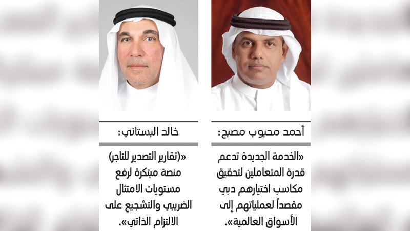 وتم إطلاق خدمة «تقارير التصدير للتاجر» في لقاء افتراضي، حضره المدير العام لجمارك دبي، أحمد محبوب مصبح، والمدير العام للهيئة الاتحادية للضرائب، خالد علي البستاني، والمديرون التنفيذيون، ومديرو الإدارات والمراكز الجمركية من الجانبين.