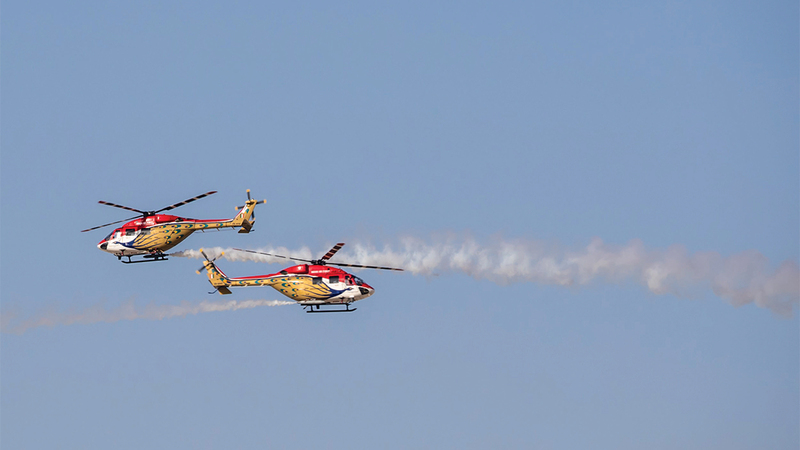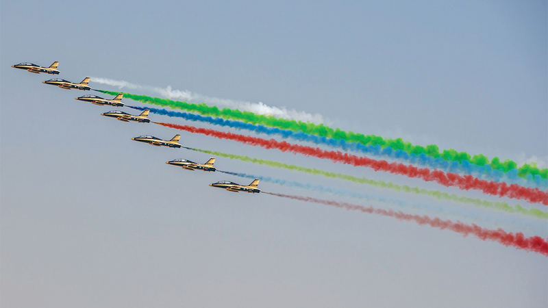 ويضم العرض الجوي مناورات يقدمها فريق «فرسان الإمارات للاستعراضات الجوية» التابع للقوات الجوية والدفاع الجوي، وفريق «الفرسان الروس» التابع للقوات الجوية الروسية، وفريق «سريا كيران» التابع للقوات الجوية الهندية، وفريق الصقور السعودي للاستعراضات الجوية.