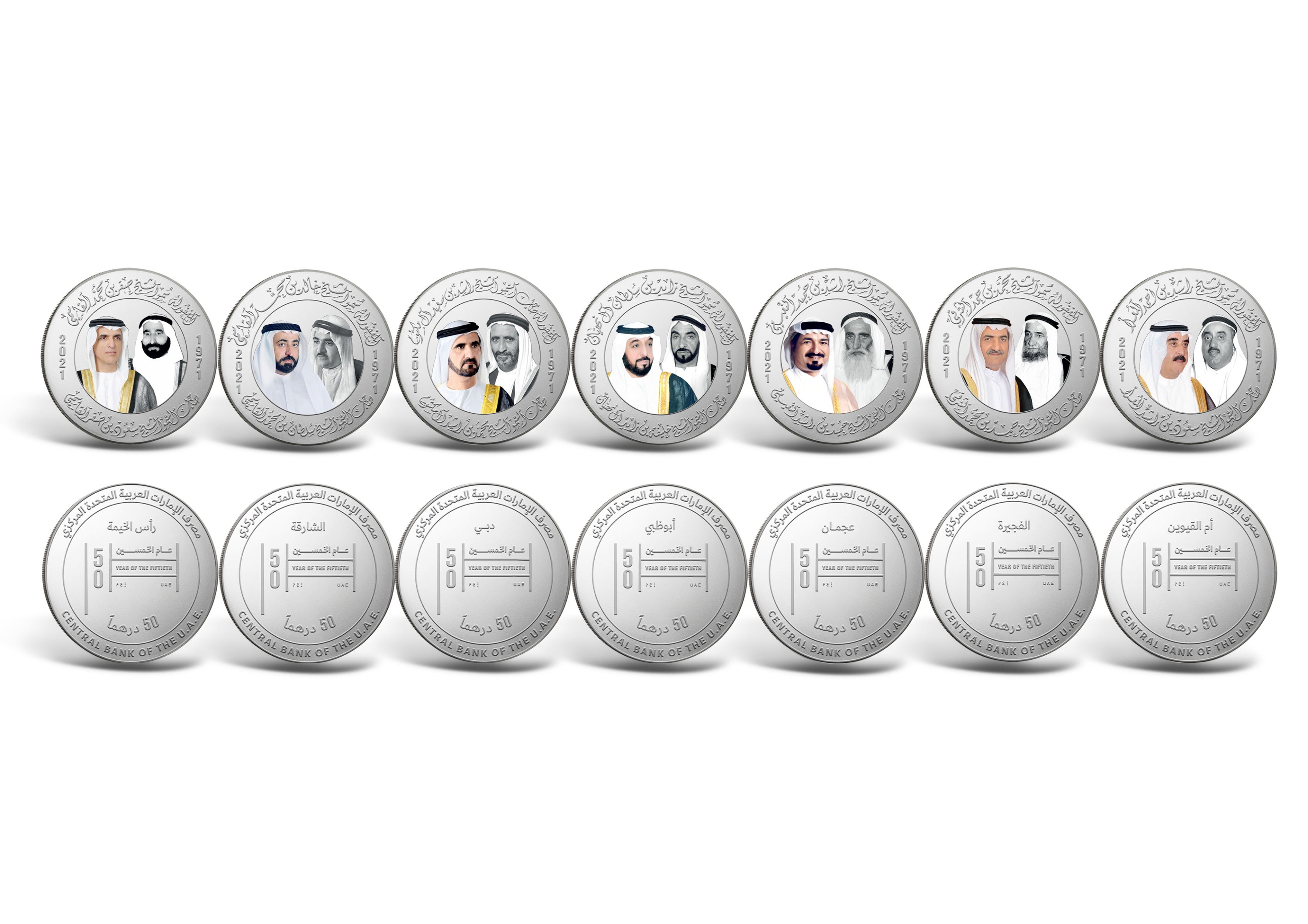 أعلن مصرف الإمارات العربية المتحدة المركزي عن إصدار سبع مسكوكات تذكارية مـن الفضة في حافظة واحدة، وذلك احتفاءً بالذكرى الخمسين لتأسيس اتحاد دولة الإمارات العربية المتحدة، وتكريمًا للآباء المؤسسين وعلى رأسهم مؤسس الاتحاد وباني نهضة الدولة المغفور له بإذن الله الشيخ زايد بن سلطان آل نهيان، طيب الله ثراه.