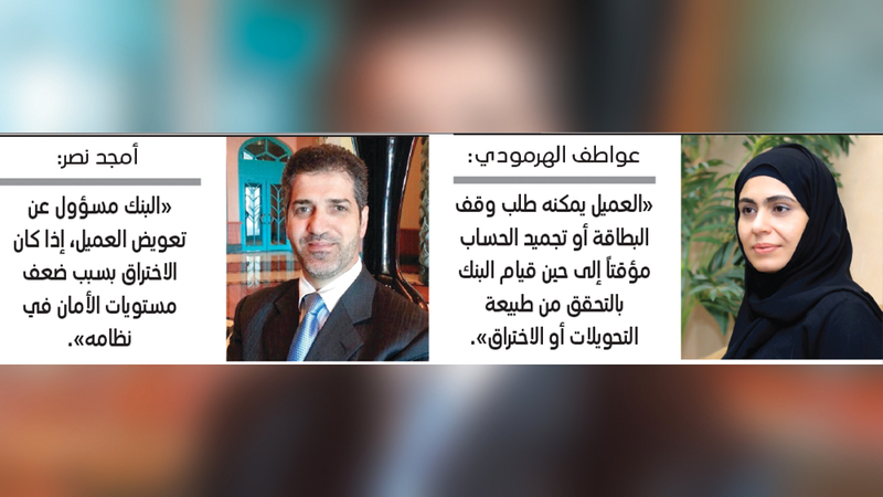 وأضافت أن «العميل يمكنه طلب وقف البطاقة الائتمانية، أو تجميد الحساب مؤقتاً إلى حين قيام البنك بالتحقق من طبيعة التحويلات أو الاختراق»، لافتة إلى أن «بوسع العميل أيضاً اللجوء إلى التطبيق الذكي لوقف بطاقته الائتمانية، مع كتابة السبب في ذلك، بأنه (السرقة أو الاختراق)»، ومبينة «أن البنك إذا تحقق من وجود اختراق للبطاقة، يقوم بوقفها تماماً، ثم إرسال بديل لها مجاناً إلى العميل، كما يتم مخاطبة شركتي (فيزا) و(ماستر كارد) لوقف المدفوعات التي تمت باستخدام البطاقة من قبل المخترقين». ونوهت بأن «مثل هذه التحقيقات عادة تستغرق وقتاً، قد يصل إلى شهر، إلى حين استرجاع المبالغ المسحوبة، لكن بشرط أن يكون العميل قد اتخذ إجراءات العناية اللازمة، بمعنى عدم تسجيل العميل بياناته المصرفية في مواقع غير موثوقة، أما إذا ثبت عدم حرصه وحذره تجاه ذلك، فيتحمل هو كامل الخسائر».