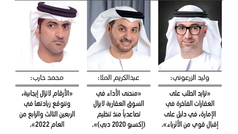 في السياق نفسه، قال رئيس مجلس إدارة «شركة دبليو كابيتال للوساطة العقارية»، وليد الزرعوني، إن أسعار العقارات السكنية في دبي شهدت زيادة مطردة خلال يناير وفبراير ومارس 2022، سواء للفلل أو الشقق، مشيراً إلى أن لـ«إكسبو 2020» الفضل الأكبر في تحسن المبيعات، بالتزامن مع بدء تحول الزوار من مرحلة الاستكشاف إلى الاستثمار.