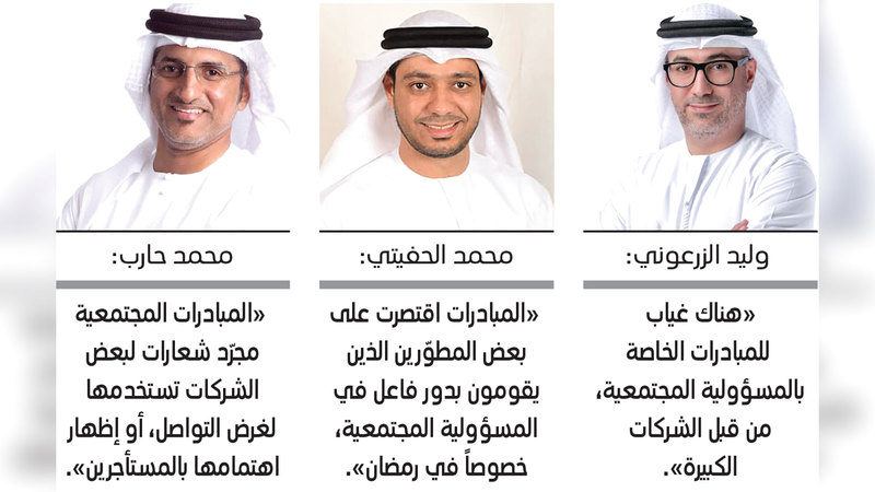 بدوره، قال المدير العام لشركة «الليوان الملكي للعقارات»، محمد حارب، إن «المبادرات المجتمعية أصبحت مجرد شعارات لبعض الشركات تستخدمها لغرض التواصل، أو لتفعيل دور المؤسسة أو الشركة في إظهار اهتمامها بالمقيمين»، مشيراً إلى ضرورة تفعيل تلك المبادرات بشكل عام لجميع الشركات العقارية، خصوصاً في شهر رمضان.