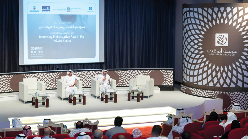 الجلسة التوعوية ناقشت في مقر «غرفة أبوظبي» رفع نسبة التوطين في القطاع الخاص. من المصدر