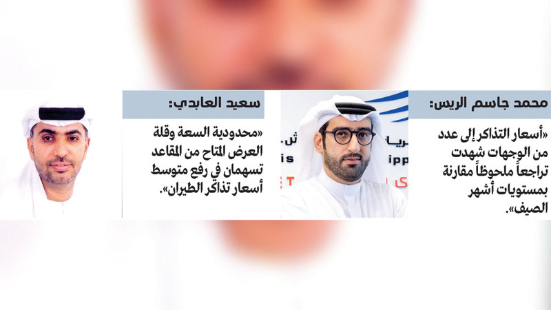 بدوره، قال رئيس شركة «العابدي»، القابضة للسياحة والسفر، سعيد العابدي، إن أسعار تذاكر الطيران لاتزال مرتفعة في المتوسط مقارنة بهذه الفترة من العام، إلا أنها أقل من معدلاتها مقارنة بمستويات فصل الصيف، مشيراً إلى أن العروض والأسعار المخفضة تركزت في بعض الوجهات دون غيرها.