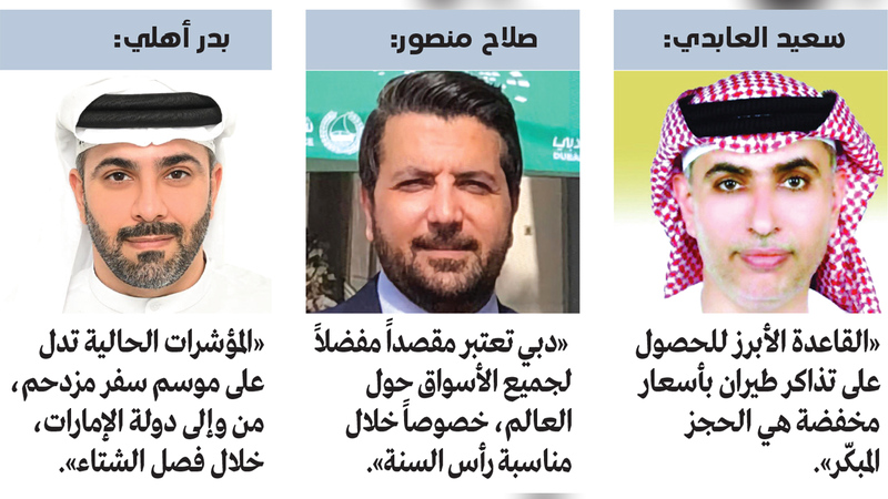 في سياق متصل، قال المدير التنفيذي لشركة «دبي العالمية للسفريات»، بدر أهلي، إن «المؤشرات الحالية تدل على موسم سفر مزدحم، من وإلى دولة الإمارات، خلال فصل الشتاء، بالتزامن مع الإجازات والأعياد، وأيضاً الطلب الكبير على قضاء عطلات داخل الدولة»، لافتاً إلى أن هذا الطلب سينعكس بشكل واضح على أسعار تذاكر الطيران.