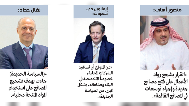 من جانبه، قال المدير العام لشركة «المكرم» الصناعية، إيمانويل دي سميدت، إنه «من المتوقع أن تستفيد الشركات المحلية، خصوصاً المتخصصة في البناء وصناعاته، بشكل كبير، من السياسة الجديدة التي تتبعها الإمارات بخصوص دعم المنتجات المحلية، خصوصاً من حيث زيادة مبيعاتها وتعزيز جهودها التسويقية»، مشيراً إلى أنه «ينبغي على الشركات المحلية، العمل بقوة خلال الفترة الراهنة لتسويق منتجاتها وإدخالها في المشاريع الكبيرة التي تنفذها الشركات الكبرى، لتحقيق الاستفادة القصوى من هذه السياسات الجديدة».