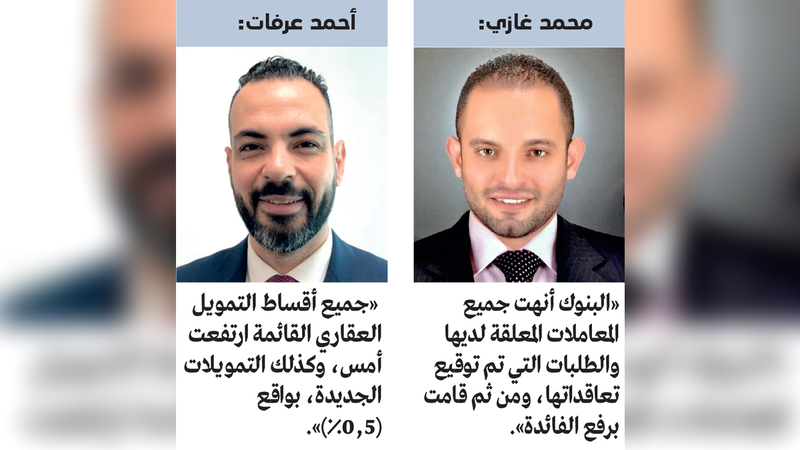 من جهته، قال الخبير المصرفي، أحمد عرفات، إن «جميع أقساط التمويل العقاري القائمة ارتفعت أمس، وكذلك التمويلات الجديدة، بواقع (0.5%)، لتصل إلى 4.99%، صعوداً من 4.49% الشهر الماضي»، موضحاً أن «هذا الرفع جاء بعد فترة من التأجيل لتطبيق قرار المصرف المركزي برفع الفائدة الرئيسة بواقع 75 نقطة أساس، حيث تم الانتهاء من كل المعاملات المعلقة، بجانب دراسة هل سيتم الرفع بنفس نسبة (المركزي) أو أقل، وهو ما حدث بالفعل، حيث اكتفت البنوك بزيادة 0.5%، على أن يتم تثبيتها لمدة ثلاث سنوات في كل التمويلات، ومن ثم تتحرك مع (الإيبور)، سعر الإقراض بين البنوك، صعوداً وهبوطاً».