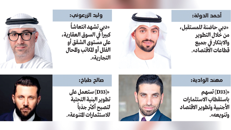 وأشاروا لـ«الإمارات اليوم» إلى أن أجندة «D33» تحمل فرصاً كبيرة للقطاع العقاري، خصوصاً الفئات المرتبطة بقطاع الأعمال، كالمكاتب والمحال التجارية، وأيضاً القطاع السكني سيكون له نصيب منها، بالتزامن مع التوقعات بزيادة عدد سكان دبي وصولاً لـ5.8 ملايين نسمة بحلول عام 2040.