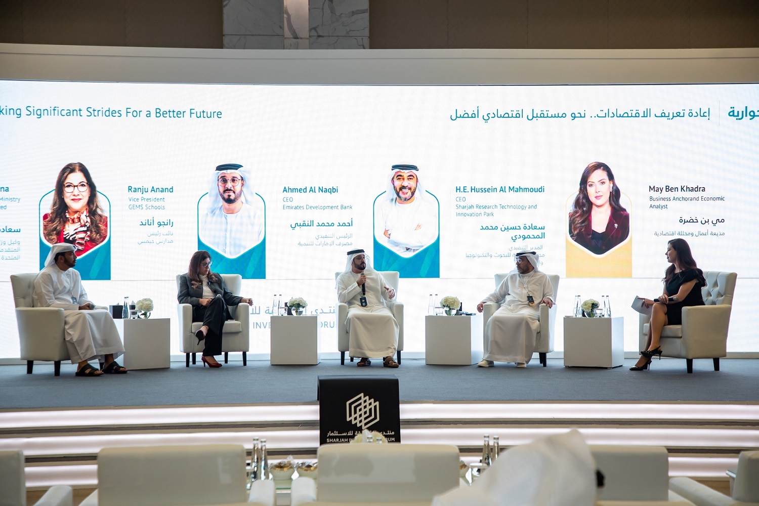 جاء ذلك خلال جلسة حوارية بعنوان "إعادة تعريف الاقتصادات، نحو مستقبل اقتصادي أفضل" عقدت ضمن فعاليات الدورة السادسة من "منتدى الشارقة للاستثمار" التي ينظمها مكتب الشارقة للاستثمار الأجنبي المباشر (استثمر في الشارقة) وشارك فيها كل من سعادة عمر صوينع وكيل وزارة الصناعة والتكنولوجيا المتقدمة وسعادة حسين محمد المحمودي المدير التنفيذي لمجمع الشارقة للبحوث والتكنولوجيا والابتكار وأحمد محمد النقبي الرئيس التنفيذي لمصرف الإمارات للتنمية ورانجو أناند نائب رئيس مدارس جيمس.