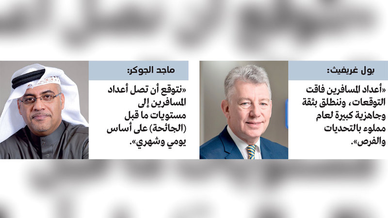 من جهته، بيّن الرئيس التنفيذي للعمليات في مؤسسة مطارات دبي، ماجد الجوكر، أن توقعات المؤسسة بوصول أعداد المسافرين خلال العام الجاري إلى 78 مليون مسافر، جاءت في ظل الأداء القوي في العمليات وحركة المسافرين خلال الفترة الماضية، مشيراً إلى أن المؤسسة تتوقع أن تصل أعداد المسافرين إلى مستويات ما قبل «الجائحة» في عام 2019 خلال العام الجاري على أساس يومي وشهري.