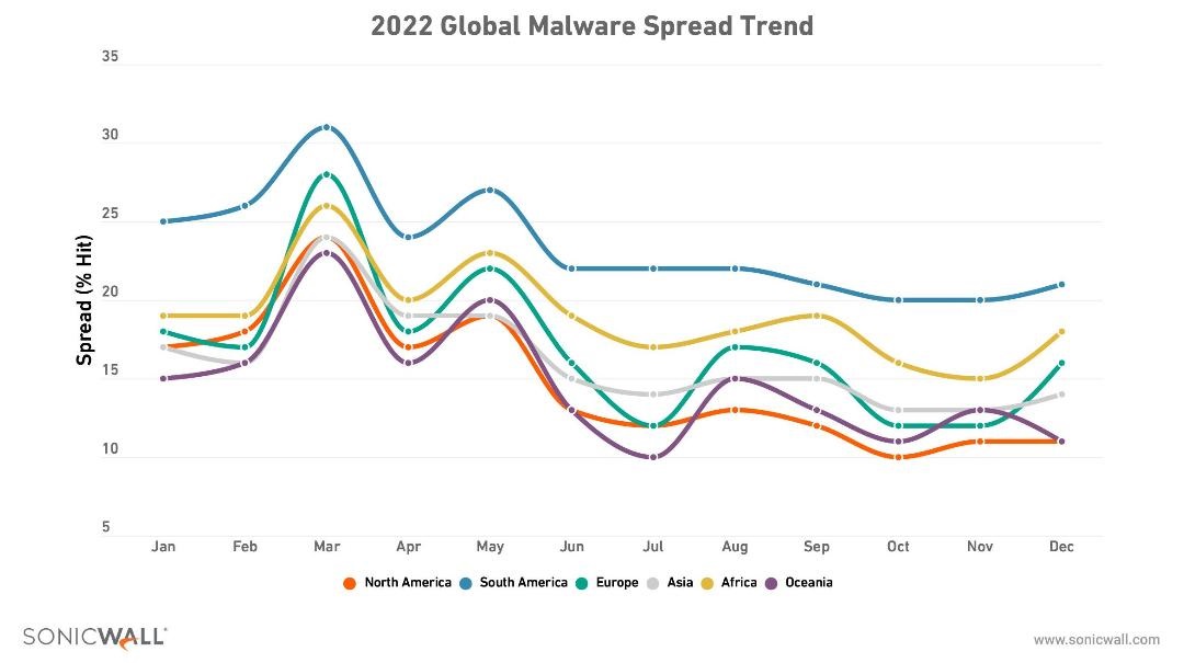 يستخدم مجرمو الإنترنت أدوات وأساليب متطورة أكثر فأكثر لاستغلال الضحايا وابتزازهم، مع ارتفاع وتيرة النشاط الذي ترعاه الدولة كمصدر قلق. وبينما لا تزال برامج الفدية تشكل تهديداً، يتوقع الباحثون في سونيك وول كابتشر لابز (SonicWall Capture Labs) المزيد من الأنشطة التي ترعاها الدولة وتستهدف مجموعة أكبر من الضحايا في العام 2023، بما في ذلك الشركات الصغيرة والمتوسطة والمؤسسات.