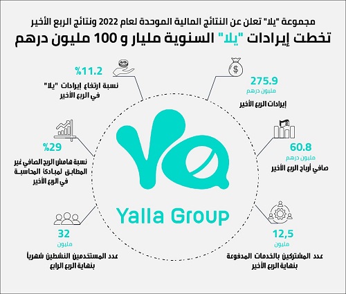 أعلنت «مجموعة يلاّ المحدودة»، مالكة أكبر منصة للترفيه الرقمي والتواصل الاجتماعي في الشرق الأوسط وشمال إفريقيا، عن نتائجها المالية غير المدققة للعام المالي المنتهي 31 ديسمبر 2022، إضافة إلى النتائج المالية للربع الأخير من العام نفسه.