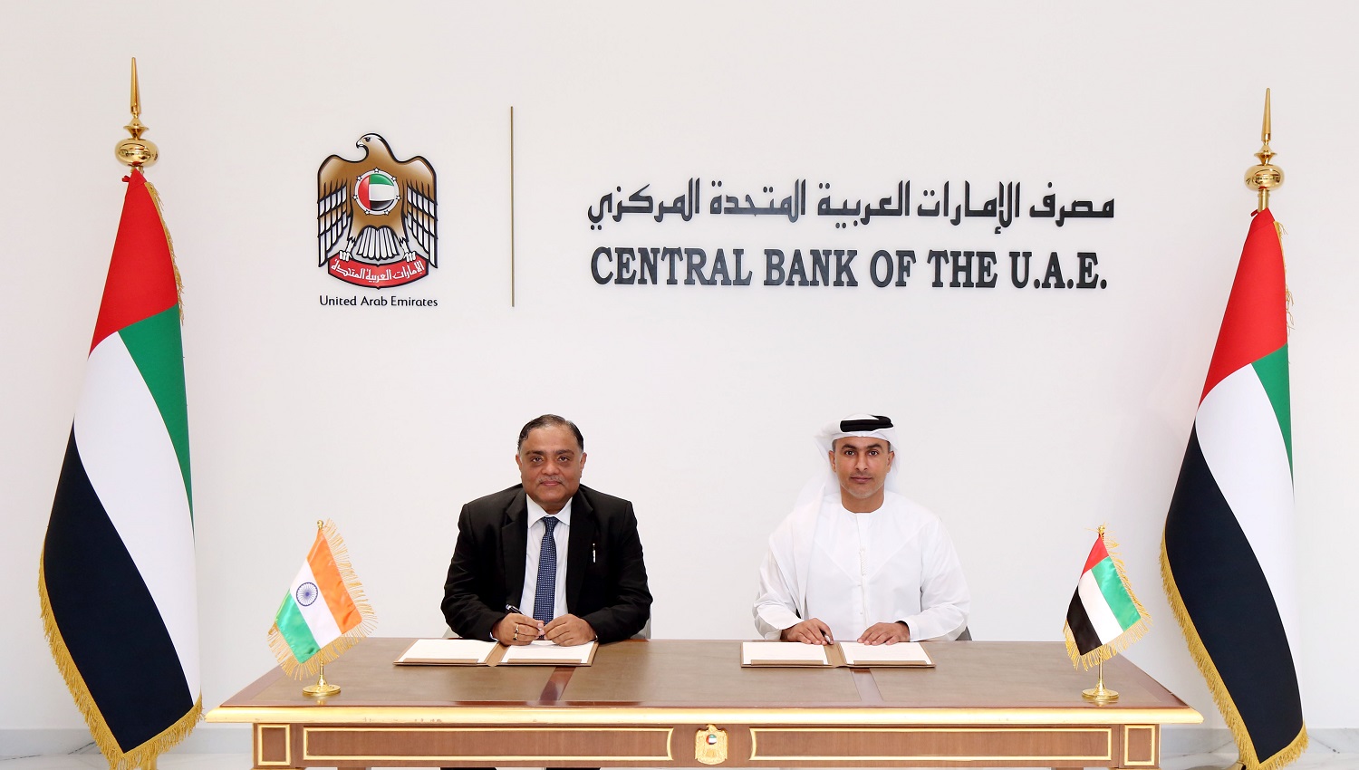 وقع المذكرة، سيف حميد الظاهري، مساعد المحافظ لشؤون الاستراتيجية والبنية التحتية المالية والتحول الرقمي، وأجاي كومار تشودري، المدير التنفيذي للبنك الاحتياطي الهندي.