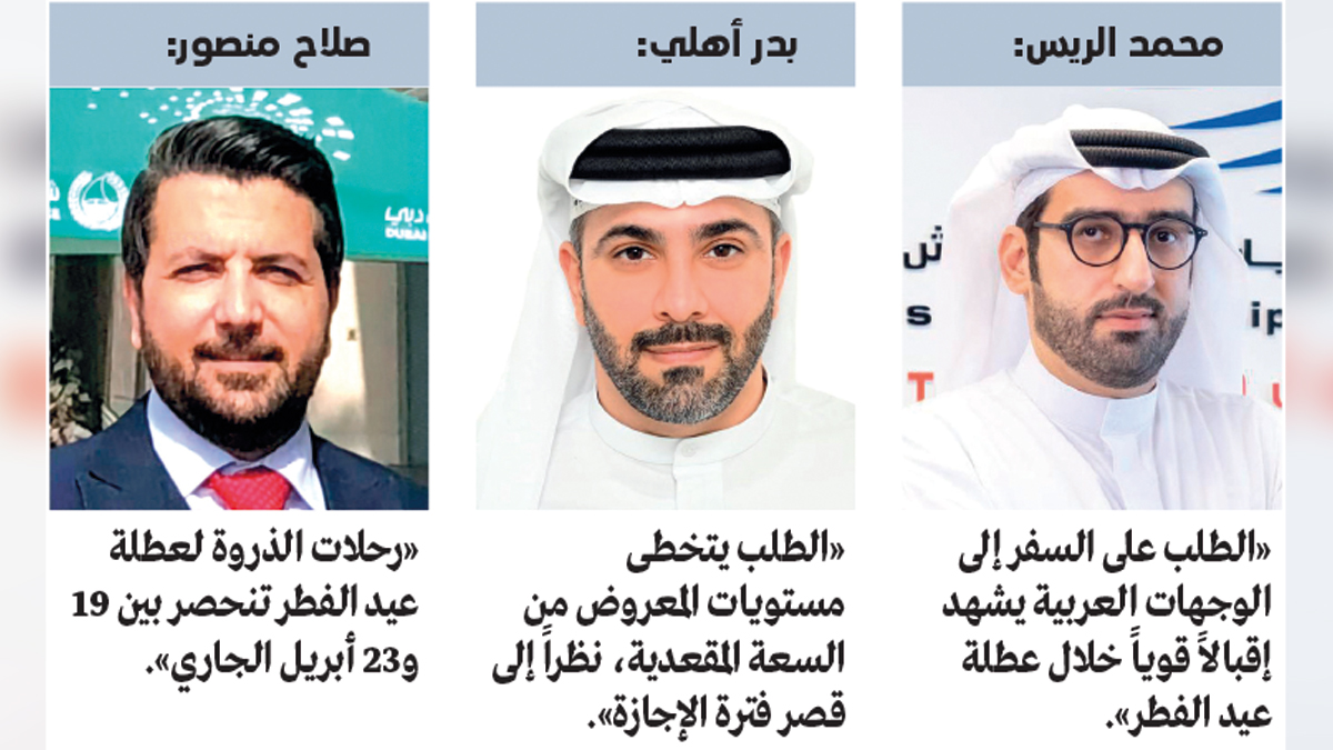 بدوره، قال نائب الرئيس التنفيذي لـ«شركة الريّس للسفريات»، محمد جاسم الريس، إن «الطلب على السفر إلى الوجهات العربية يشهد إقبالاً قوياً خلال عطلة عيد الفطر»، مشيراً إلى أن ذلك انعكس على زيادة في متوسط أسعار التذاكر بنسبة تصل إلى 30%، مقارنة بالمعدلات منذ بداية العام الجاري، مع تخطي مستويات الطلب مستويات المعروض من السعة المقعدية على الرحلات.