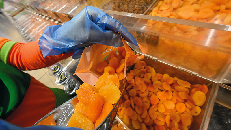 الفواكه المجففة تتوافر في الأسواق بأشكال مختلفة منها ما يباع معبأ أو تكون منتجات سائبة تباع بالوزن.