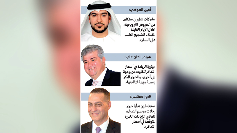 وأضاف العوضي أن «شركات الطيران ستكثف من العروض الترويجية بأسعار مخفضة، خلال الأيام القليلة المقبلة، لتشجيع الطلب على السفر»، مشيراً إلى أن هناك شريحة من المتعاملين، خصوصاً الأفراد يفضلون السفر بغرض السياحة وزيارة الأهل عندما تكون الأسعار في مستويات متدنية.