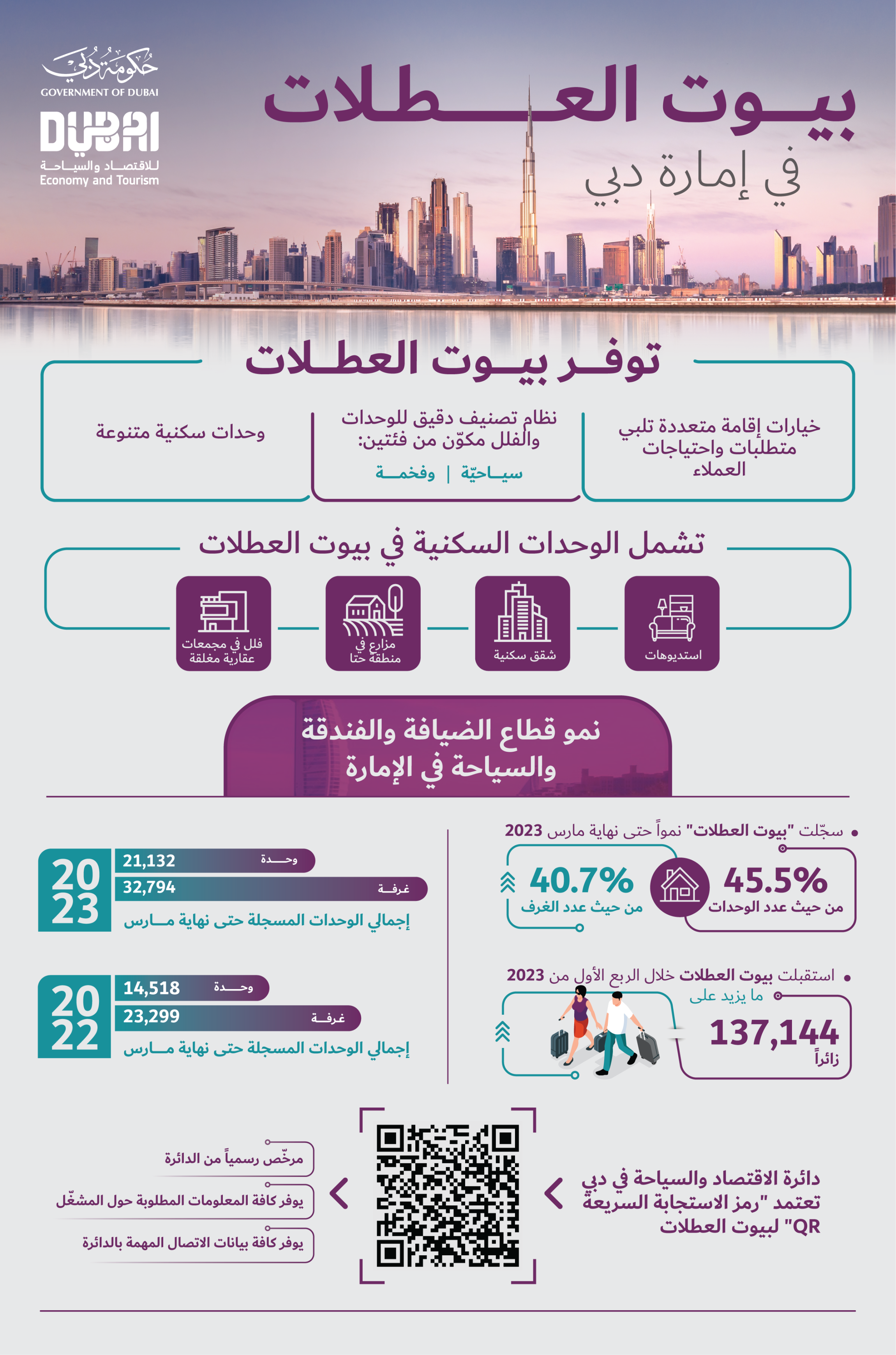 وقد شهدت "بيوت العطلات" في دبي نمواً قوياً خلال الفترة الماضية، إذ تُشير بيانات الدائرة إلى أنّ مجموع الوحدات المسجلة لديها وصل إلى 21,132 وحدة، وفرت 32,794 غرفة بنهاية مارس 2023، بنمو 45.5% من حيث عدد الوحدات و40.7% من ناحية عدد الغرف مقارنة بنهاية مارس 2022، إذ بلغت حينها 14,518 وحدة، بعدد 23,299 غرفة بنهاية مارس من العام 2022. وقد استقبلت بيوت العطلات خلال الربع الأول من العام الجاري 137,144 زائراً.