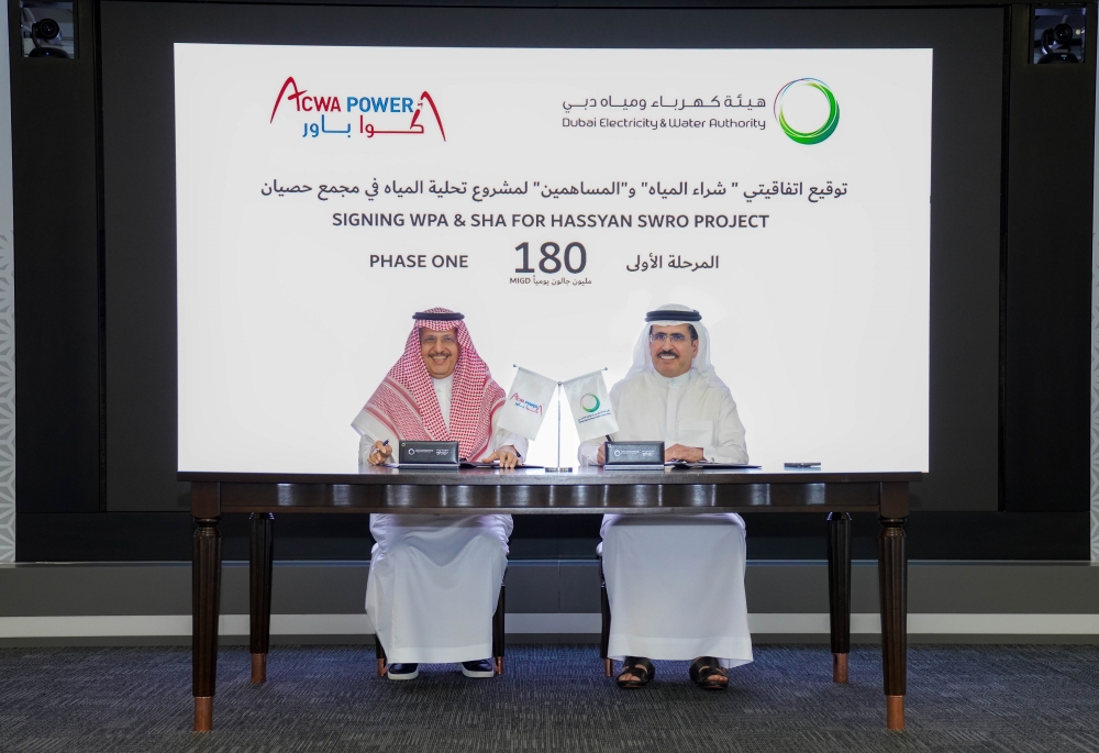 وقعت هيئة كهرباء ومياه دبي «ديوا» مع شركة «أكوا باور» السعودية، اتفاقيتي «المساهمين» و«شراء المياه» لمدة 30 عاماً للمرحلة الأولى من مشروع مجمع حصيان لتحلية مياه البحر بتقنية التناضح العكسي باستخدام الطاقة الشمسية وفق نموذج المنتج المستقل للمياه.
