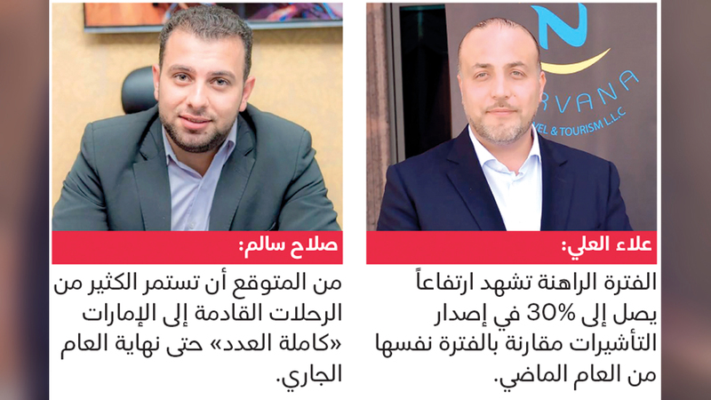 وتفصيلاً، قال الرئيس التنفيذي لشركة «نيرفانا للسفر والسياحة»، علاء العلي، إن «الفترة الراهنة تشهد ارتفاعاً بنسبة تراوح بين 20 و30% في حركة إصدار التأشيرات السياحية للسفر إلى الإمارات مقارنةً بالفترة نفسها من العام الماضي».