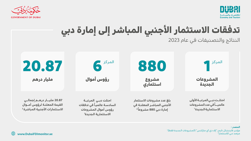 وسجلت دبي ارتفاعاً سنوياً في استقطاب رؤوس أموال الاستثمار الأجنبي المباشر العالمية التي وصلت إلى 20.87 مليار درهم إماراتي (5.68 مليارات دولار أميركي)، ما أسهم في ارتقاء الإمارة من المرتبة الثامنة عالمياً في النصف الأول من عام 2022 إلى المرتبة السادسة في الفترة نفسها من العام الجاري، وفقاً لبيانات «فايننشال تايمز - إف دي آي ماركتس» حول أسواق الاستثمار الأجنبي المباشر.