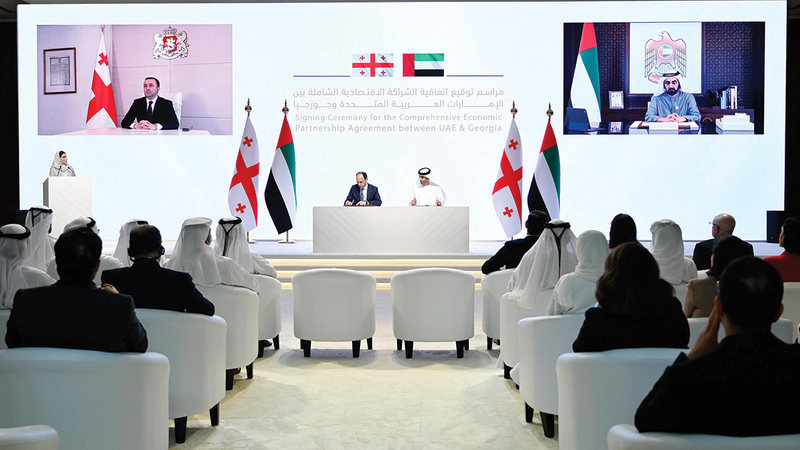شهد صاحب السمو الشيخ محمد بن راشد آل مكتوم، نائب رئيس الدولة رئيس مجلس الوزراء حاكم دبي، ورئيس وزراء جورجيا، إيراكلي غاريباشفيلي، أمس، توقيع اتفاقية الشراكة الاقتصادية الشاملة بين دولة الإمارات وجورجيا الهادفة إلى مضاعفة التجارة غير النفطية من 481 مليون دولار (1.76 مليار درهم) إلى 1.5 مليار دولار سنوياً (5.5 مليارات درهم) في غضون خمسة أعوام.