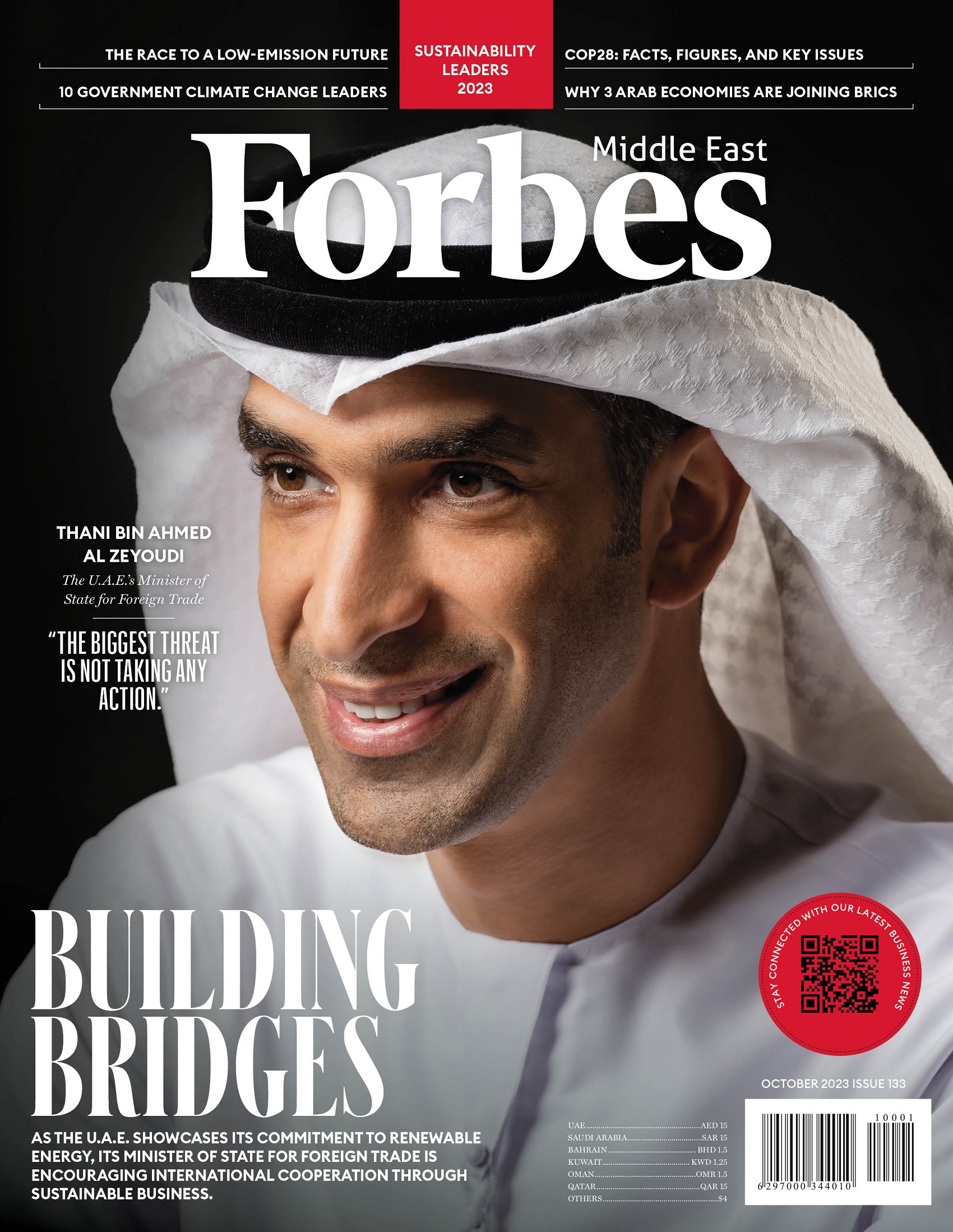 وفي قصة غلاف "فوربس" لعدد أكتوبر 2023، قال وزير دولة للتجارة الخارجية، ثاني بن أحمد الزيودي، في لقاء حصري، حول أهمية تعاون قادة العالم معا لإحداث التغيير بشأن قضية التغير المناخي، إن "الوضع الراهن ليس مقبولًا، لذا علينا التوقف عن لوم بعضنا بعضا، والعمل على حل المشكلة معا، فالخطر الأكبر يتمثل في عدم اتخاذ أي إجراء".