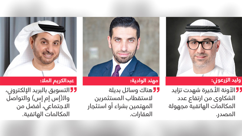 بدوره، قال المدير الإداري في «شركة هاربور العقارية»، مهند الوادية، إن «المكالمات الهاتفية غير المرخصة من قِبل المسوّقين العقاريين أصبحت ظاهرة مزعجة، تستوجب المواجهة من قِبل جميع الجهات المعنية بالقطاع العقاري»، موضحاً أن «هناك وسائل بديلة لاستقطاب المهتمين بالشراء أو الاستئجار».