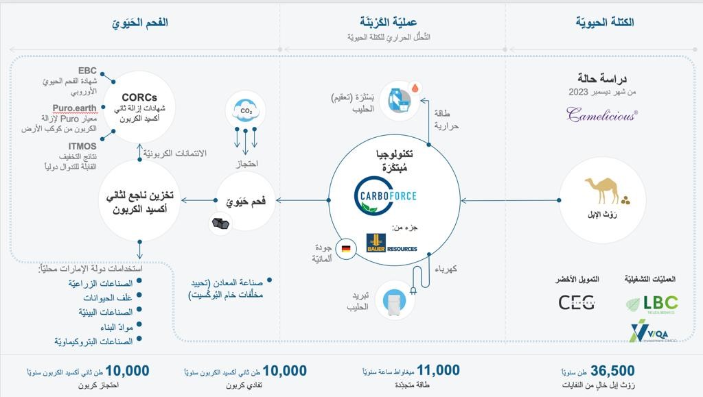 أعلنت شركة فيكا للاستثمار الألمانية عن التعاون مع مصنع الامارات لإنتاج حليب الإبل ومشتقاته (Camelicious)، للبدء في انتاج الفحم الحيوي الصناعي باستخدام مخلفات الإبل. وترتكز هذه الشراكة الاستراتيجية على رؤية مشتركة لتسخير الإمكانات الكامنة في مخلفات الإبل " الروث"، وذلك باستخدام أحدث تكنولوجيا تحويل الفحم الحيوي، حيث تهدف إلى تجديد المناظر الطبيعية الصحراوية القاحلة، وتحويلها إلى أراضٍ خصبة وصالحة للزراعة لتعزيز الأمن الغذائي، وتشجيع الزراعة.