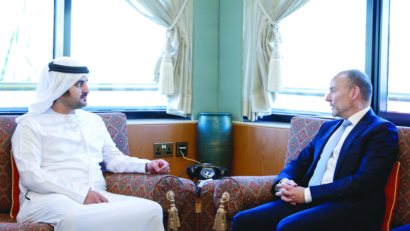 مكتوم بن محمد خلال لقائه بيتر هيرويك. من المصدر