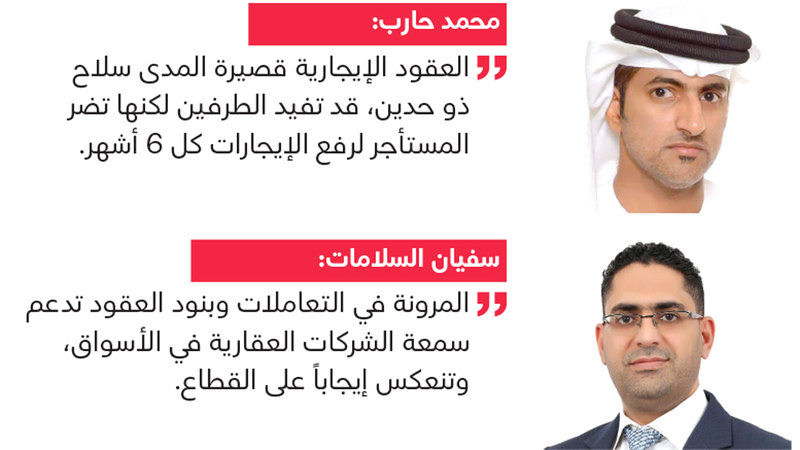 وأشار حارب إلى مشكلة في موضوع العقود القصيرة التي تكون مدتها ستة أشهر، وتتمثل في أنه يمكن للمالك أن يرفع القيمة الإيجارية بعد انتهاء الفترة الإيجارية. وقال: «العقود الإيجارية قصيرة المدى سلاح ذو حدين، ففي بعض الحالات قد تفيد الطرفين، لكن على المدى الطويل قد تضر المستأجر بسبب توجه المُلّاك لرفع الإيجارات كل ستة أشهر».