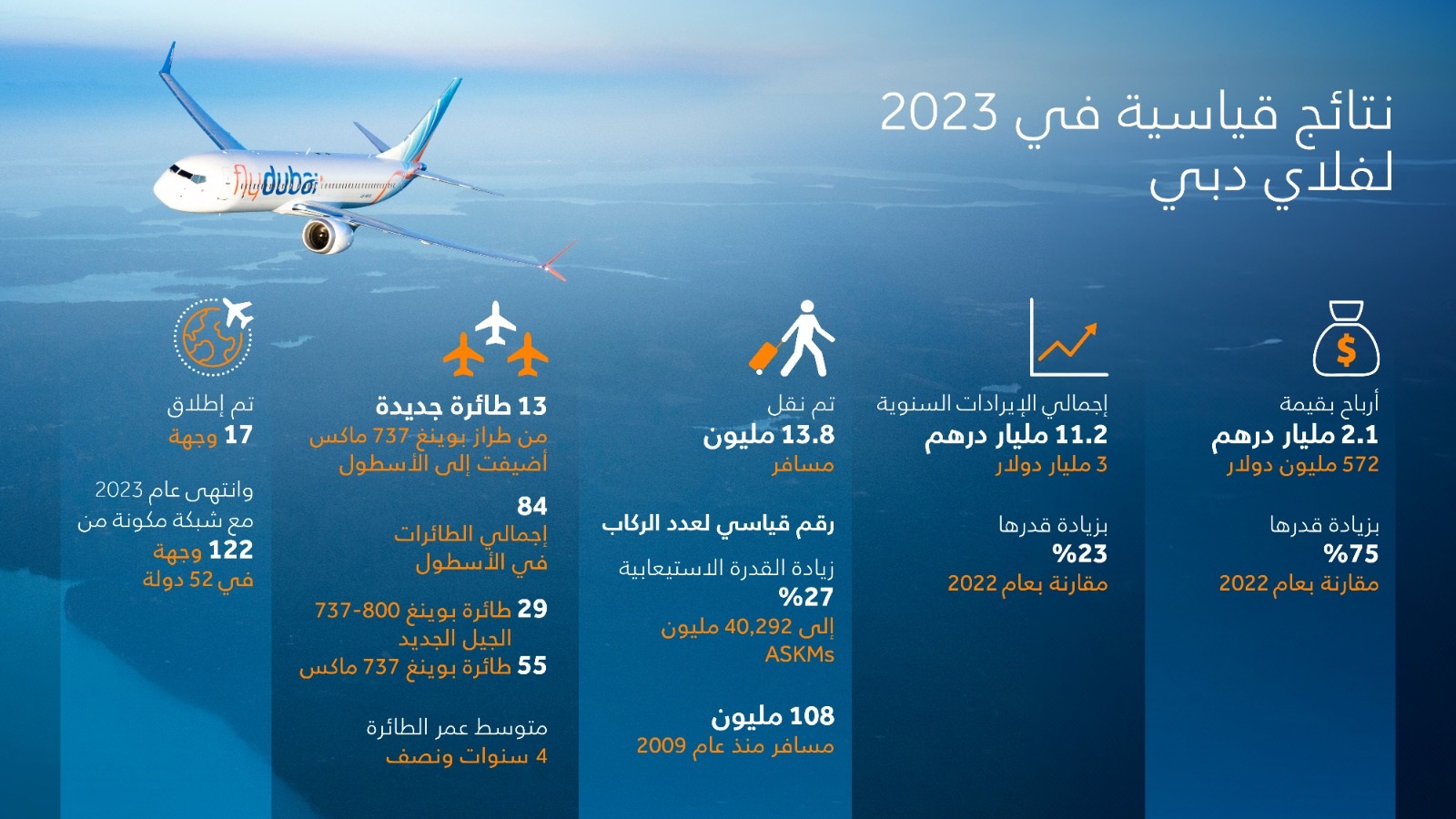 ووفقاً للنتائج المالية والتشغيلية، فقد نقلت «فلاي دبي» 13.8 مليون مسافر بنمو نسبته 31% مقارنة بعام 2022، ومتجاوزاً مستوى 11 مليون مسافر الذي تحقق قبل جائحة «كوفيدـ19».