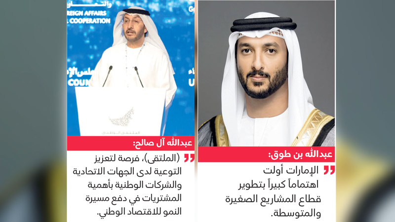 من جانبه، قال وكيل وزارة الاقتصاد، عبدالله أحمد آل صالح: «يُشكل الملتقى الوطني للمشاريع الصغيرة والمتوسطة، فرصة مهمة لتعزيز التوعية لدى الجهات الحكومية الاتحادية والشركات الوطنية بأهمية المشتريات في دفع مسيرة النمو للاقتصاد الوطني، ودعم فرص المشاركة لأصحاب المشاريع الصغيرة والمتوسطة الوطنية في المناقصات الحكومية المتوقع طرحها للعام الحالي».