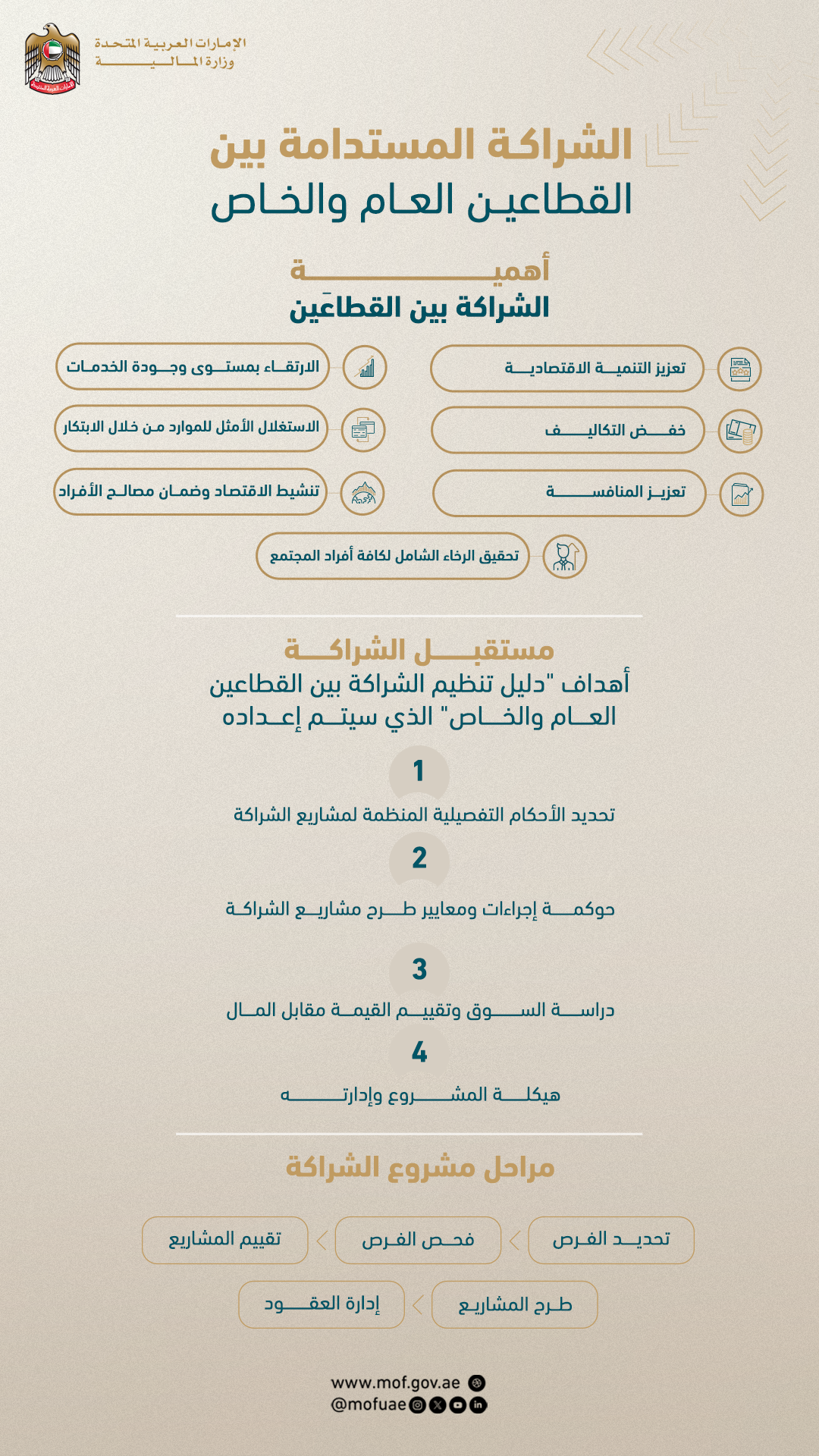 وفي إطار سعي وزارة المالية لدعم جهود الدولة الرامية إلى تحفيز المشاريع المشتركة بين الجهات الاتحادية والقطاع الخاص، ستعد وزارة المالية دليل تنظيم الشراكة بين القطاعين العام والخاص والذي يُحدد الأحكام التفصيلية المنظمة لمشاريع الشراكة، لحوكمة إجراءات ومعايير طرح مشاريع الشراكة بما في ذلك اقتراح المشاريع وآلية طلب الاستيضاح، وأيضاً دراسة السوق وتقييم القيمة مقابل المال وهيكلة المشروع وإدارته.