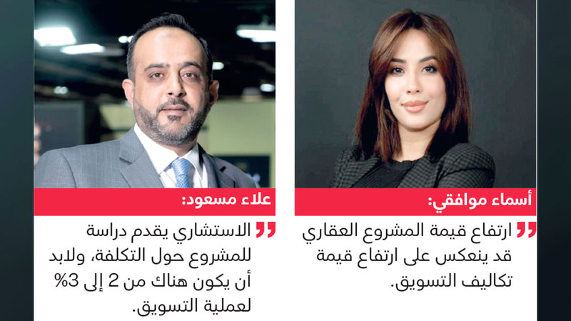 من جهته، قال خبير التسويق العقاري، علاء مسعود، إن «الاستشاري يقدم دراسة للمشروع حول التكلفة، ولابد أن تكون هناك من 2 إلى 3% لعملية التسويق، وبعض المطورين يرفعها إلى 5% من القيمة الإجمالية للمشروع».