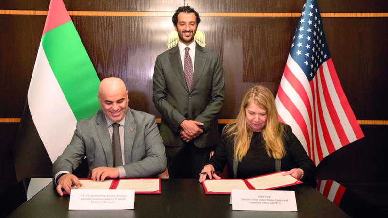 وجرى توقيع المذكرة بحضور وزير الاقتصاد، عبدالله بن طوق المري، حيث وقع من جانب دولة الإمارات الوكيل المساعد لقطاع الملكية الفكرية بوزارة الاقتصاد، الدكتور عبدالرحمن حسن المعيني، ومن جانب الولايات المتحدة، وكيل وزارة التجارة الأميركية للملكية الفكرية، ومدير مكتب الولايات المتحدة لبراءات الاختراع والعلامات التجارية، كاثرين ك. فيدال.