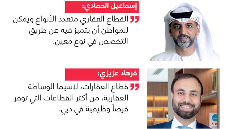 في السياق نفسه، قال الرئيس التنفيذي لـ«شركة عزيزي للتطوير العقاري»، فرهاد عزيزي، إن «قطاع العقارات، لاسيما الوساطة العقارية، من أكثر القطاعات التي توفر فرصاً وظيفية في دبي، ويشهد منافسة شديدة وتبني لممارسات وتقنيات جديدة ومتطورة، ما يتطلب من المواطنين تطوير إمكاناتهم ومواكبة اتجاهات السوق بشكل دائم».