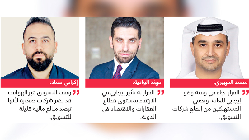 في السياق نفسه، قال رئيس مجلس إدارة شركة «دبليو كابيتال» للوساطة العقارية، وليد الزرعوني: «يُعدُّ قرار وزارة الاقتصاد الخاص بمكالمات التسويق الهاتفية قراراً جيداً، وجاء في وقته». أما المستشار العقاري، عبدالله كاظم، فلفت إلى أن المكالمات التسويقية طريقة قديمة في مجال التسويق، ولا تولد الثقة مع المستثمر أو الراغب في شراء العقار، بل على العكس من ذلك، فهي تضر بالقطاع العقاري أكثر مما تفيده.
