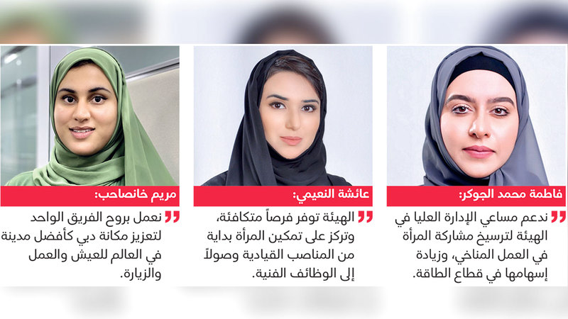من جهتها، قالت مدير إدارة مركز الابتكار في الهيئة، الدكتورة عائشة النعيمي: «توفر الهيئة فرصاً متكافئة للرجل والمرأة، وتركز على تمكين المرأة بداية من المناصب القيادية وصولاً إلى الوظائف الفنية، حيث يشمل دعم الهيئة للمرأة في مجال الطاقة النظيفة والمتجددة ابتكار برامج تدريبية متخصصة، وورش عمل تعليمية لرفع مستوى الوعي وبناء القدرات، وتعزيز الكفاءات الفنية للموظفات وفتح آفاق جديدة للابتكار في هذا القطاع الحيوي». وأضافت: «تؤكد هذه المساعي التزام الهيئة بدعم دور المرأة في تحقيق الاستدامة وتطوير مصادر الطاقة المتجددة، وتعزيز مكانتها عنصراً فعالاً ومؤثراً في مسيرة التقدم والتطور التكنولوجي».