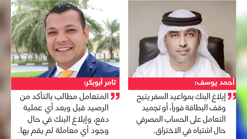 وقال الخبير المصرفي أحمد يوسف: «نظراً لأن عدداً كبيراً من المواطنين والمقيمين في الدولة يسافرون خلال العطلة الصيفية إلى وجهات متعددة، سواء إلى بلدانهم الأم، أو لغرض السياحة في دول أخرى، فإن أول نصيحة وخطوة يجب على المتعامل الالتزام بها هي إبلاغ البنك الذي يتعامل معه بموعد المغادرة والرجوع، والوجهة التي يوجد فيها».