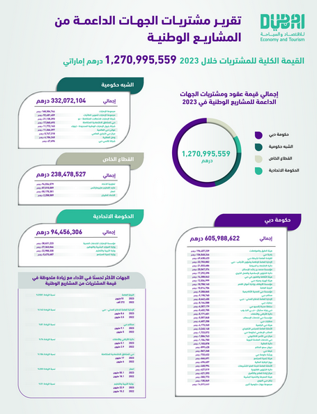 وفي عام 2023، حصل رواد الأعمال الإماراتيون والشركات الوطنية على عقود بقيمة 606 مليون درهم من دوائر وهيئات حكومة دبي، بينما بلغت المشتريات من الجهات الحكومية الاتحادية حوالي 94.46 مليون درهم، ومساهمة المؤسسات شبه الحكومية بمبلغ 332 مليون درهم، بينما وصلت مساهمة القطاع الخاص حوالي 238.48 مليون درهم.