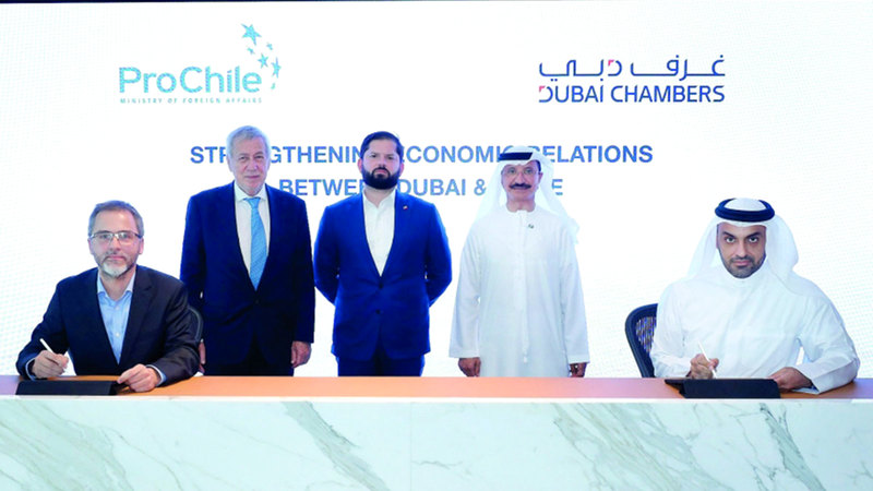 وبحضور رئيس تشيلي، غابرييل بوريك فونت، ورئيس مجلس إدارة غرفة دبي العالمية، سلطان أحمد بن سليّم، ووزير الخارجية في تشيلي، ألبرتو فان كلافيرين، تم توقيع مذكرة تفاهم لتعزيز التعاون التجاري والاستثماري والشراكات الاقتصادية بين غرف دبي والمفوضية التجارية التشيلية «برو تشيلي»، التابعة لوزارة الخارجية التشيلية.