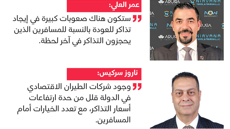وأضاف سركيس أن ارتفاع الطلب على رحلات العودة أدى إلى زيادة نسب الإشغال، ما رفع أسعار تذاكر العودة بنسب تصل إلى 40%، خصوصاً من الوجهات العربية الرئيسة للمقيمين في الدولة، وعلى رأسها مصر والأردن ولبنان وسورية، موضحاً أن سعر تذكرة رحلة العودة من إحدى الوجهات العربية (القاهرة) على سبيل المثال، وصل إلى 3000 درهم بارتفاع 40% تقريباً، لاسيما في حال الحجوزات المتأخرة.