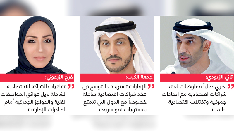 وكشف الزيودي أن دولة الإمارات تعتزم التوسع في اتفاقيات الشراكة الاقتصادية الشاملة، إذ تجري حالياً مفاوضات لعقد شراكات اقتصادية مع اتحادات جمركية وتكتلات اقتصادية عالمية، أبرزها ثلاثة تكتلات اقتصادية هي: «أوراسيا» وتكتل دول شرق إفريقيا، وتكتل دول «ميركسور» في أميركا الجنوبية.