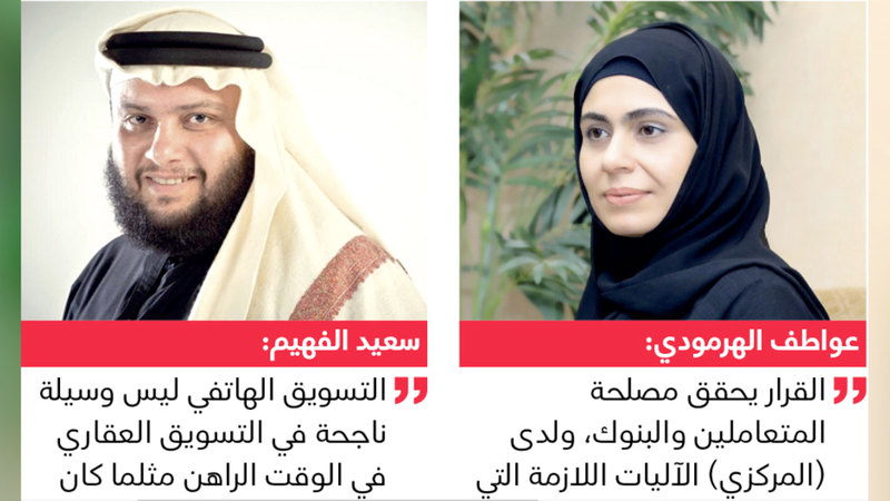 وفي وقت قالت فيه خبيرة مصرفية، إن القرار يحقق مصلحة المتعاملين والبنوك معاً، طالب مسؤول في قطاع العقارات، بتنفيذ العقوبات الواردة في القرار الوزاري، لدعم الالتزام به، مبيناً أن التسويق الهاتفي لم يعد وسيلة ناجحة للتسويق العقاري في الوقت الراهن.