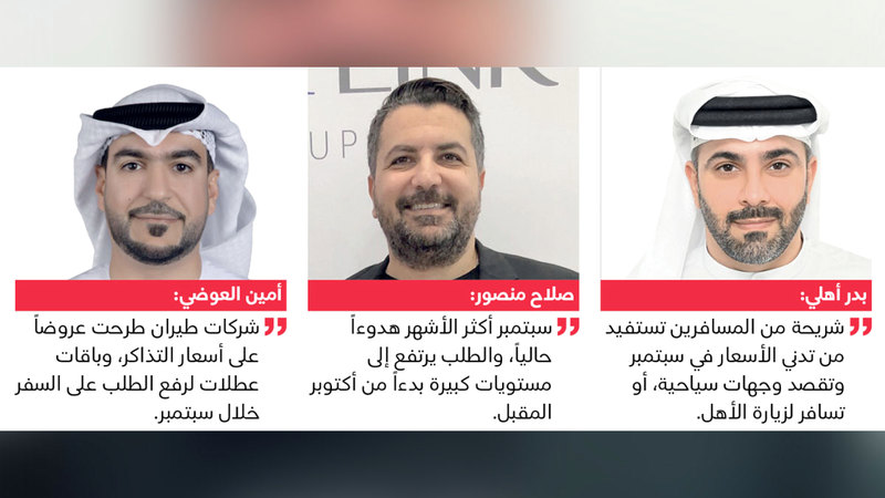 وأضاف أهلي: «اعتباراً من نهاية سبتمبر، سنلحظ ارتفاعاً تدريجياً في متوسط أسعار الرحلات الجوية، حيث تنشط خلال أكتوبر المقبل سياحة الأعمال والمؤتمرات في مختلف الأسواق، يليها الطلب السياحي في موسم الشتاء، فضلاً عن موسم العطلات في ديسمبر، حيث تصل الأسعار إلى ذروتها»، مشيراً إلى أن «سبتمبر قد يكون الفترة الأنسب للسفر بتكاليف معقولة، لكن هذا لا ينطبق على جميع الوجهات».