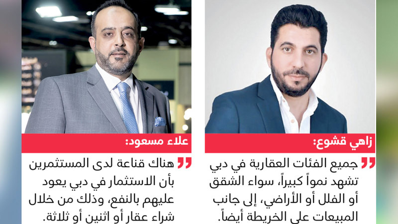 من جهته، قال خبير التسويق العقاري، علاء مسعود، إن «زخم الطلب الذي تشهده السوق العقارية في دبي حالياً، أدى إلى زيادة النشاط في القطاع، وارتفاع عدد المشترين»، مضيفاً: «هناك قناعة لدى المستثمرين بأن الاستثمار في دبي يعود عليهم بالنفع، وذلك من خلال شراء عقار أو اثنين أو ثلاثة».