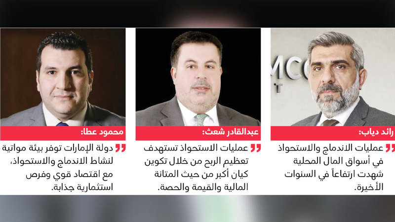 من جهته، قال مدير «شركة الأنصاري للوساطة المالية»، عبدالقادر شعث، إن عمليات الاستحواذ التي تنفذها الشركات المدرجة تستهدف تعظيم الربح، من خلال تكوين كيان أكبر من حيث المتانة المالية والقيمة والحصة السوقية في القطاع المعني بتلك العملية. وأوضح أن الشركات المدرجة تقوم بتلك العمليات، نظراً لتوافر سيولة إضافية لديها، وهذا يؤكد قوة النشاط الاقتصادي في الدولة.